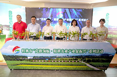 2022年7月28日,桂林市“黨旗領(lǐng)航·精耕農(nóng)業(yè)產(chǎn)業(yè)促振興”系列活動啟動儀式在七星區(qū)萬禾集團黨建活動基地舉行。市委常委、組織部部長趙衛(wèi)東出席活動并講話,市委組織部副部長唐德華主持活動,七星區(qū)委書記鄭平為活動致辭,七星區(qū)領(lǐng)導(dǎo)何濤、陳靖、劉慶娜,桂林銀行桂林分行行長杜昆,萬禾集團黨總支書記、總經(jīng)理崔萌佳參加活動。