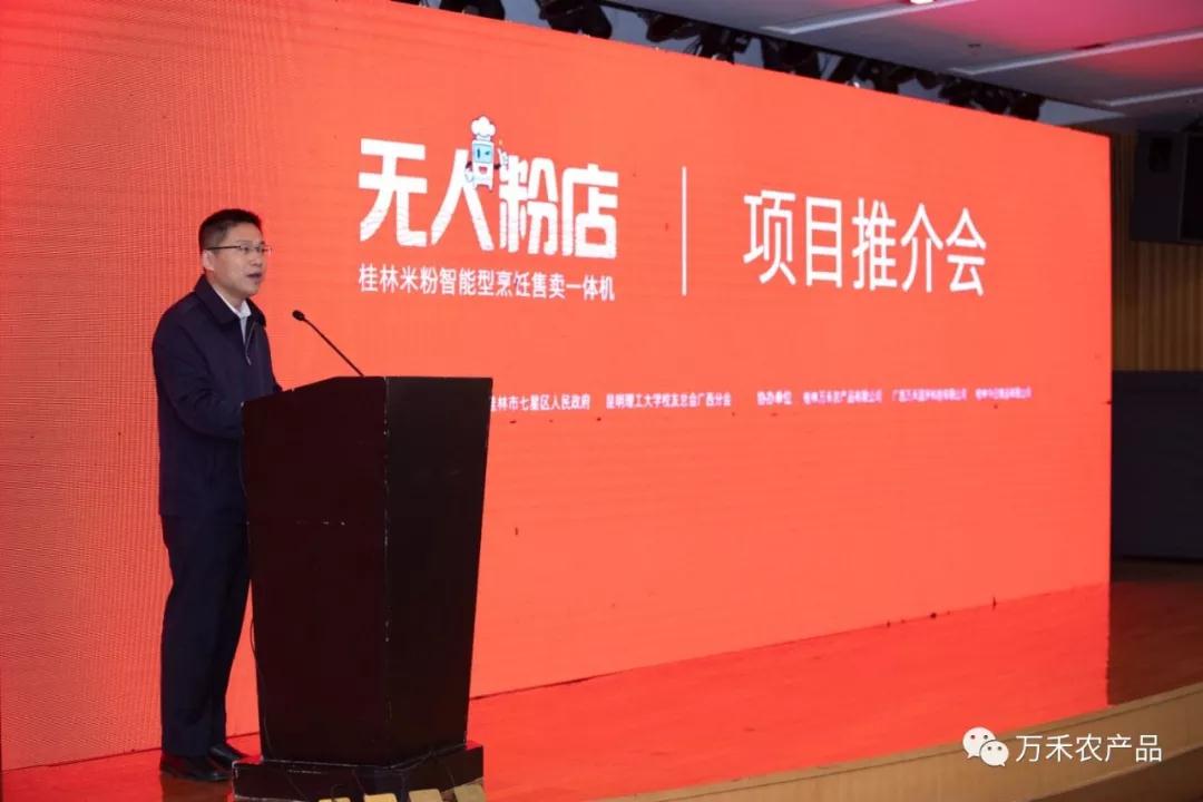 11月29日,“無人粉店—桂林米粉智能型烹飪售賣一體機項目推介會”在桂林國際會展中心舉行。這一活動由桂林國家高新區(qū)管委會、桂林市七星區(qū)政府和昆明理工大學(xué)廣西校友會共同舉辦。桂林市政府副市長樊新鴻、昆明理工大學(xué)副校長牛治亮、桂林市政協(xié)副主席鄭毅等領(lǐng)導(dǎo)出席活動現(xiàn)場。