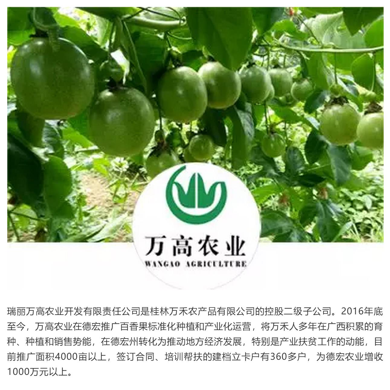 戶撒百香果種苗繁育及種植示范區(qū)由德宏州農(nóng)業(yè)農(nóng)村局經(jīng)濟作物技術(shù)推廣站和桂林萬禾農(nóng)產(chǎn)品有限公司共同建設(shè)。園區(qū)用地150畝,共有種源保護(hù)區(qū)、母本種植區(qū)、種苗擴繁區(qū)、種植示范及試驗區(qū)等四大區(qū)域,是萬禾公司在德宏州探索發(fā)展高原特色百香果產(chǎn)業(yè)嶄新有力的舉措。
