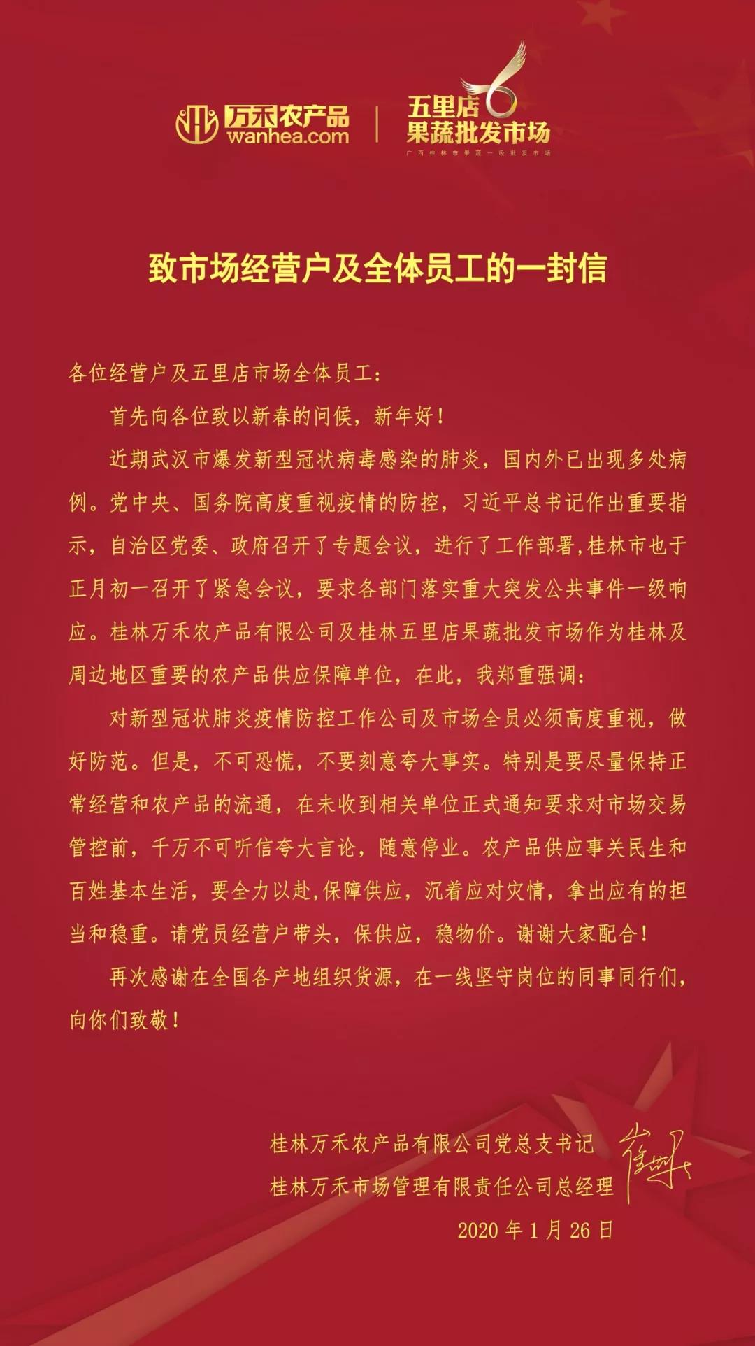 桂林萬禾農(nóng)產(chǎn)品有限公司是桂北地區(qū)重要的農(nóng)產(chǎn)品供應(yīng)保障單位,旗下五里店果蔬批發(fā)市場做為湘桂黔三省交界最大的農(nóng)產(chǎn)品交易平臺,在新型冠狀病毒感染的肺炎疫情發(fā)生以來,勇于擔(dān)當(dāng)重任,堅(jiān)守物資保障供應(yīng)的陣地。為確保桂林及周邊地區(qū)蔬菜水果供應(yīng),萬禾公司員工全面投入到抗疫情、保供應(yīng)、穩(wěn)物價(jià)工作中,以確保打贏這場疫情防控保供應(yīng)的攻堅(jiān)戰(zhàn)。