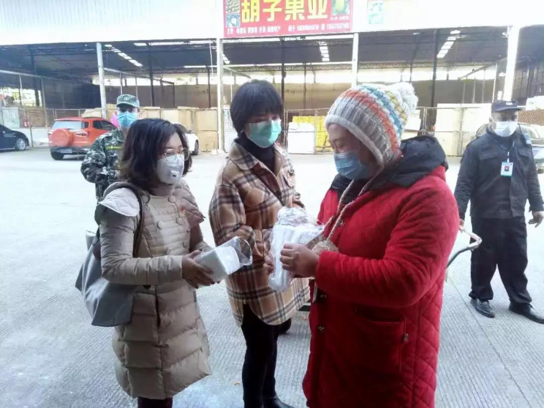 ▲萬禾公司總經(jīng)理崔萌佳(左二)與萬禾市場常務(wù)副總周雯(左一)給市場經(jīng)營戶發(fā)放口罩