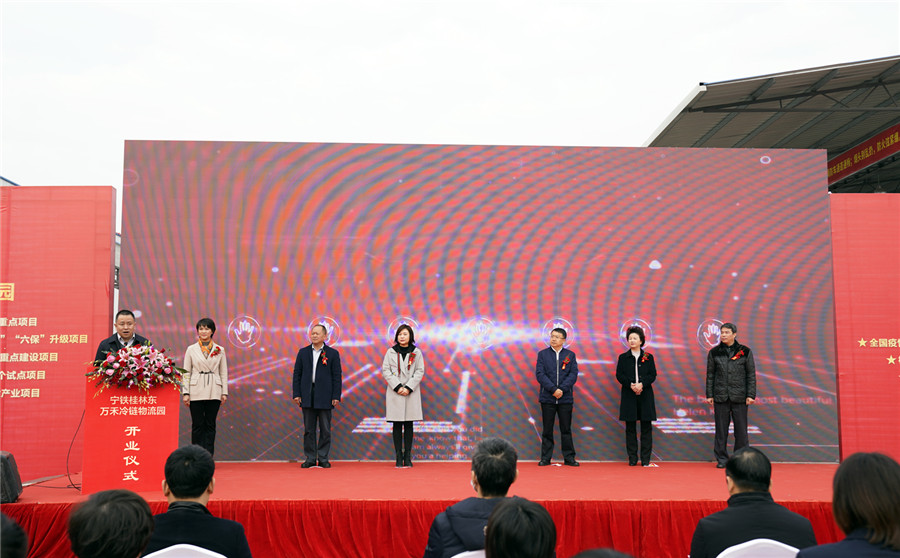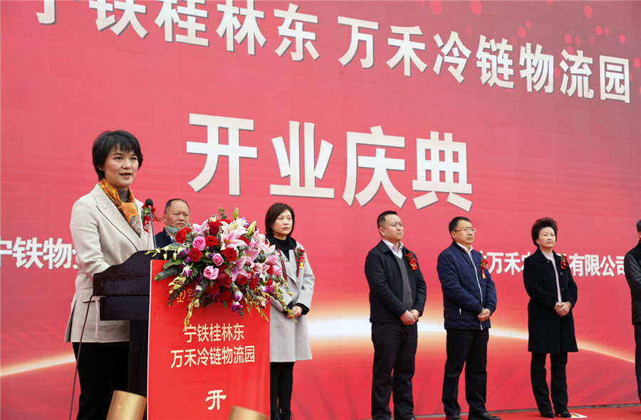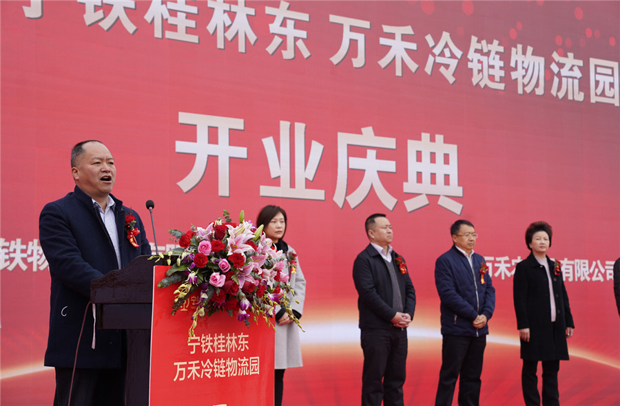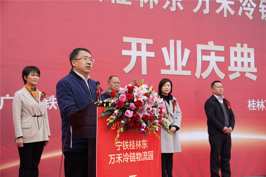 ▲桂林市政府副市長鐘洪宣布:寧鐵桂林東萬禾冷鏈物流園正式開園