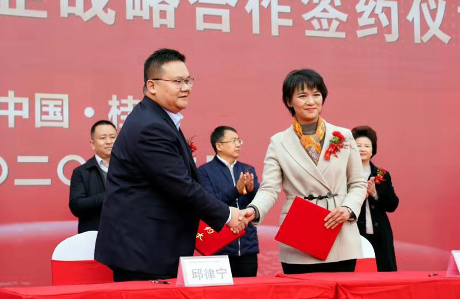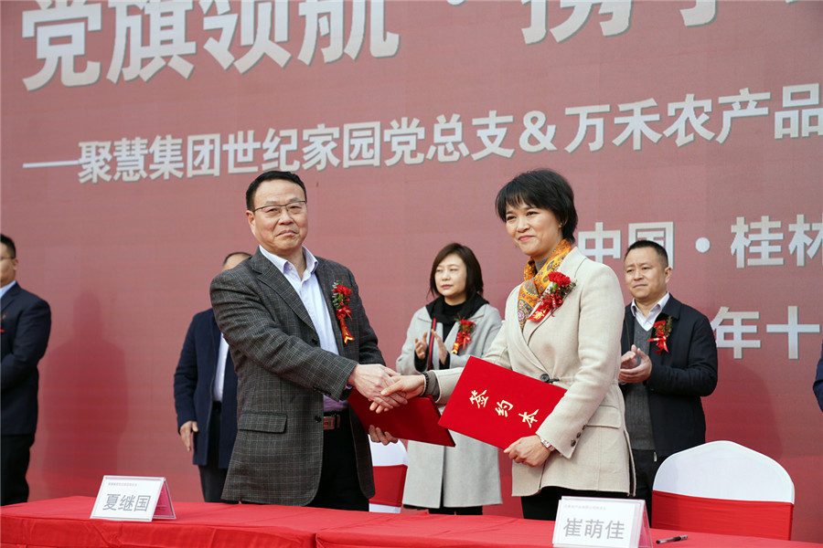 ▲黨旗領(lǐng)航·攜手助力鄉(xiāng)村 振興聚慧集團(tuán)世紀(jì)家園黨總支與桂林萬禾農(nóng)產(chǎn)品有限公司黨總支黨建共建簽約儀式