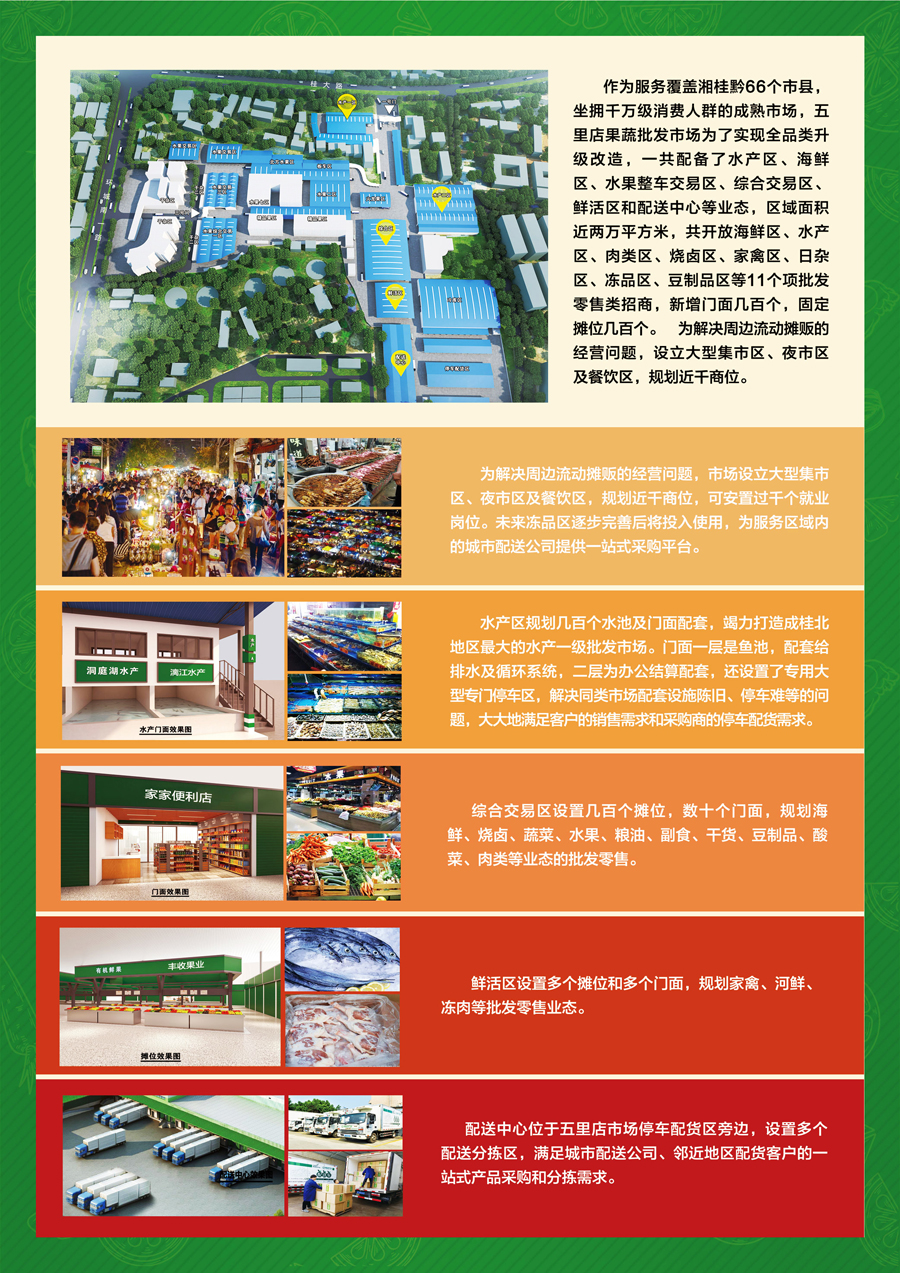作為服務(wù)覆蓋湘桂黔66個市縣,坐擁千萬級消費(fèi)人群的成熟市場,五里店果蔬批發(fā)市場為了實(shí)現(xiàn)全品類升級改造,一共配備了水產(chǎn)區(qū)、海鮮區(qū)、水果整車交易區(qū)、綜合交易區(qū)、鮮活區(qū)和配送中心等業(yè)態(tài),區(qū)域面積近兩萬平方米,共開放海鮮區(qū)、水產(chǎn)區(qū)、肉類區(qū)、燒鹵區(qū)、家禽區(qū)、日雜區(qū)、凍品區(qū)、豆制品區(qū)等11個項(xiàng)批發(fā)零售類招商,新增門面幾百個,固定攤位幾百個。為解決周邊流動攤販的經(jīng)營問題,設(shè)立大型集市區(qū)、夜市區(qū)及餐飲區(qū),規(guī)劃近千商位。