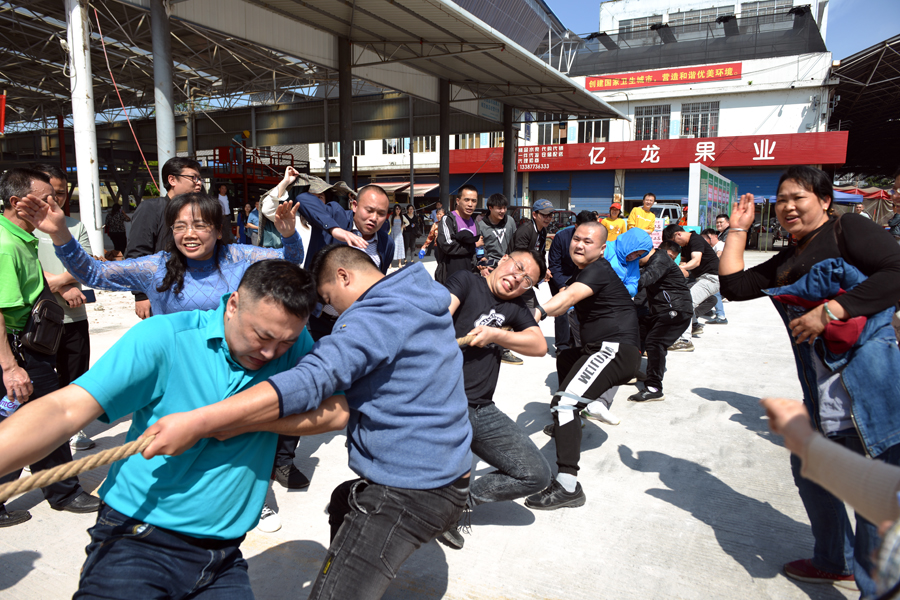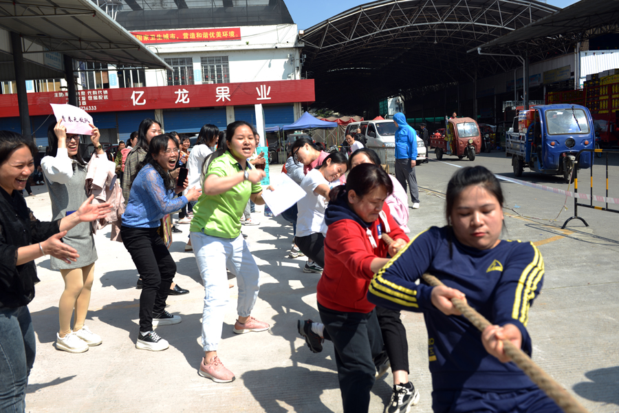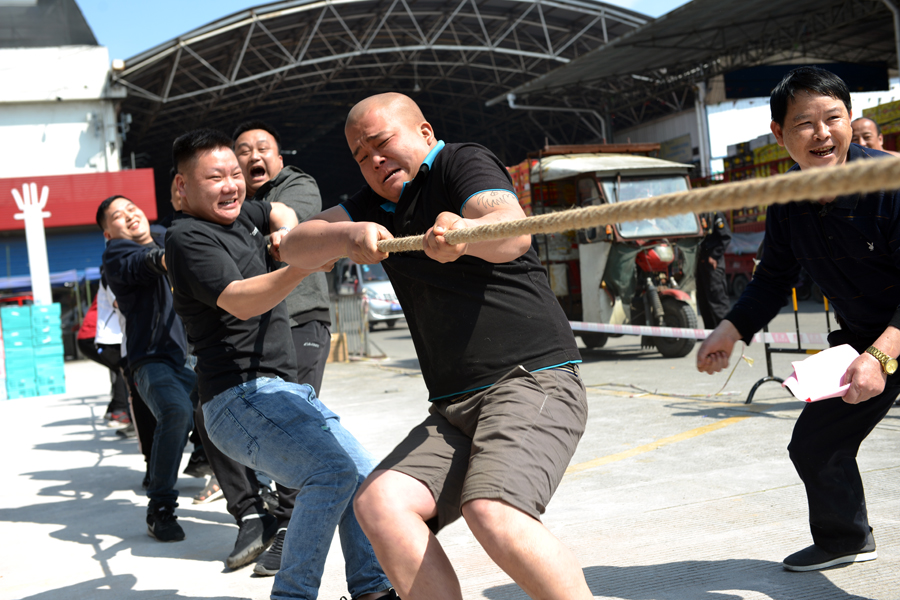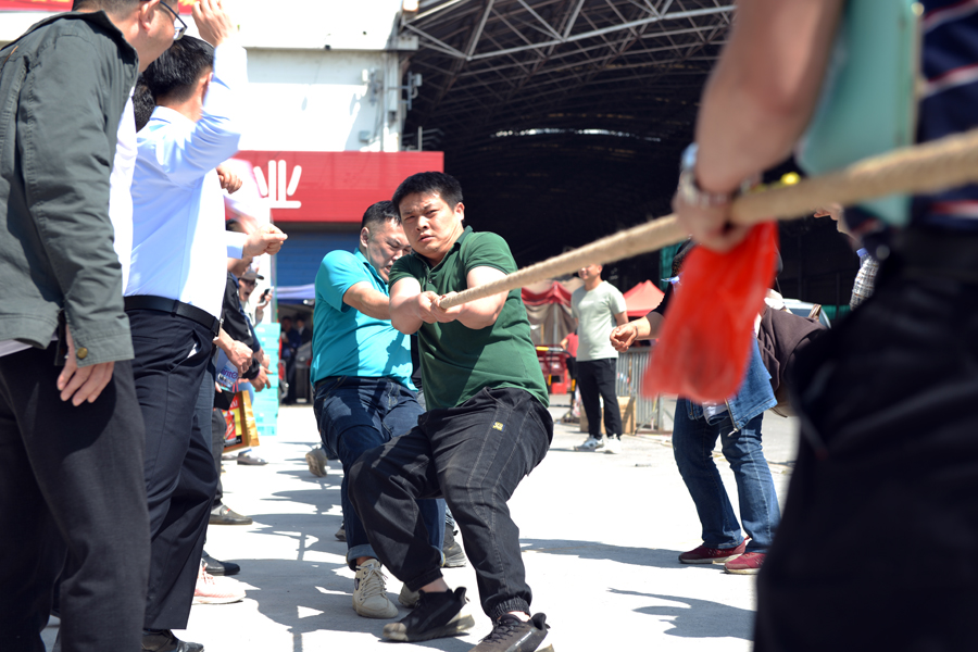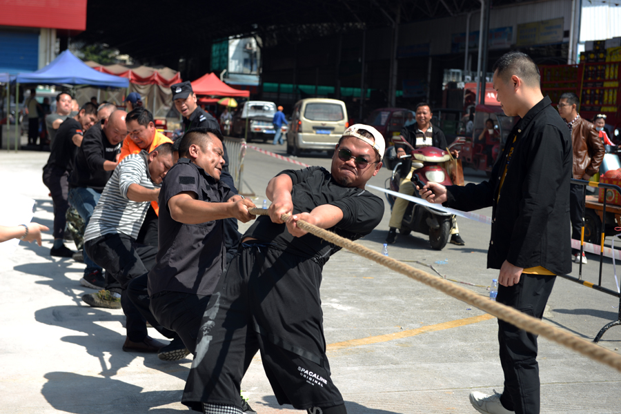 參賽隊(duì)員們排好隊(duì)列、擺正姿勢(shì),雙手緊握繩子......隨著一聲哨響,一場(chǎng)拔河比賽緊張開鑼,大繩被拉得緊緊繃繃,各組隊(duì)員們全力以赴、咬牙堅(jiān)持,“加油”的聲音響徹市場(chǎng),一旁的啦啦隊(duì)亦是全情投入,感受著運(yùn)動(dòng)帶來(lái)的快樂(lè)。
