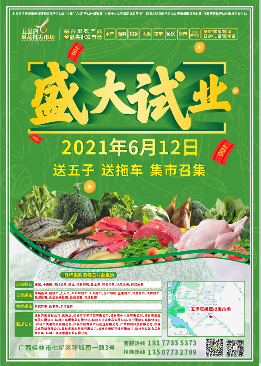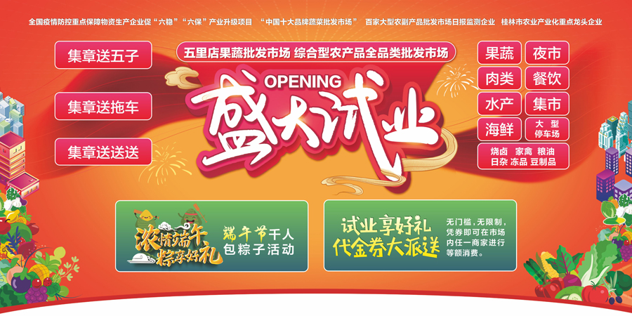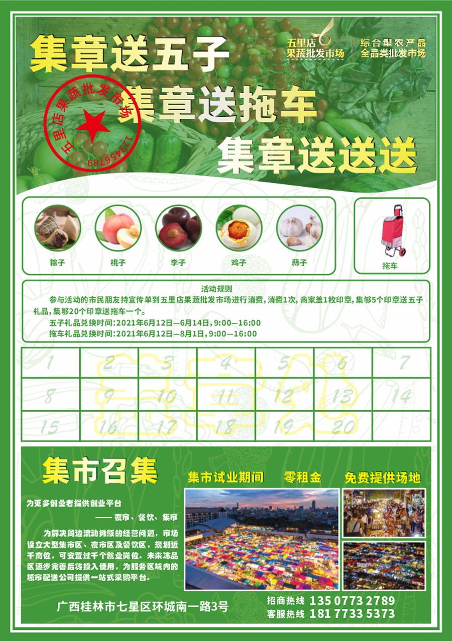 五里店果蔬批發(fā)市場——綜合型農(nóng)產(chǎn)品全品類批發(fā)市場期間試業(yè)歡迎廣大市民朋友前來市場消費(fèi),完成相應(yīng)集章數(shù)量,即可獲端午佳節(jié)五子好禮以及非常實(shí)用美觀的購物拖車。