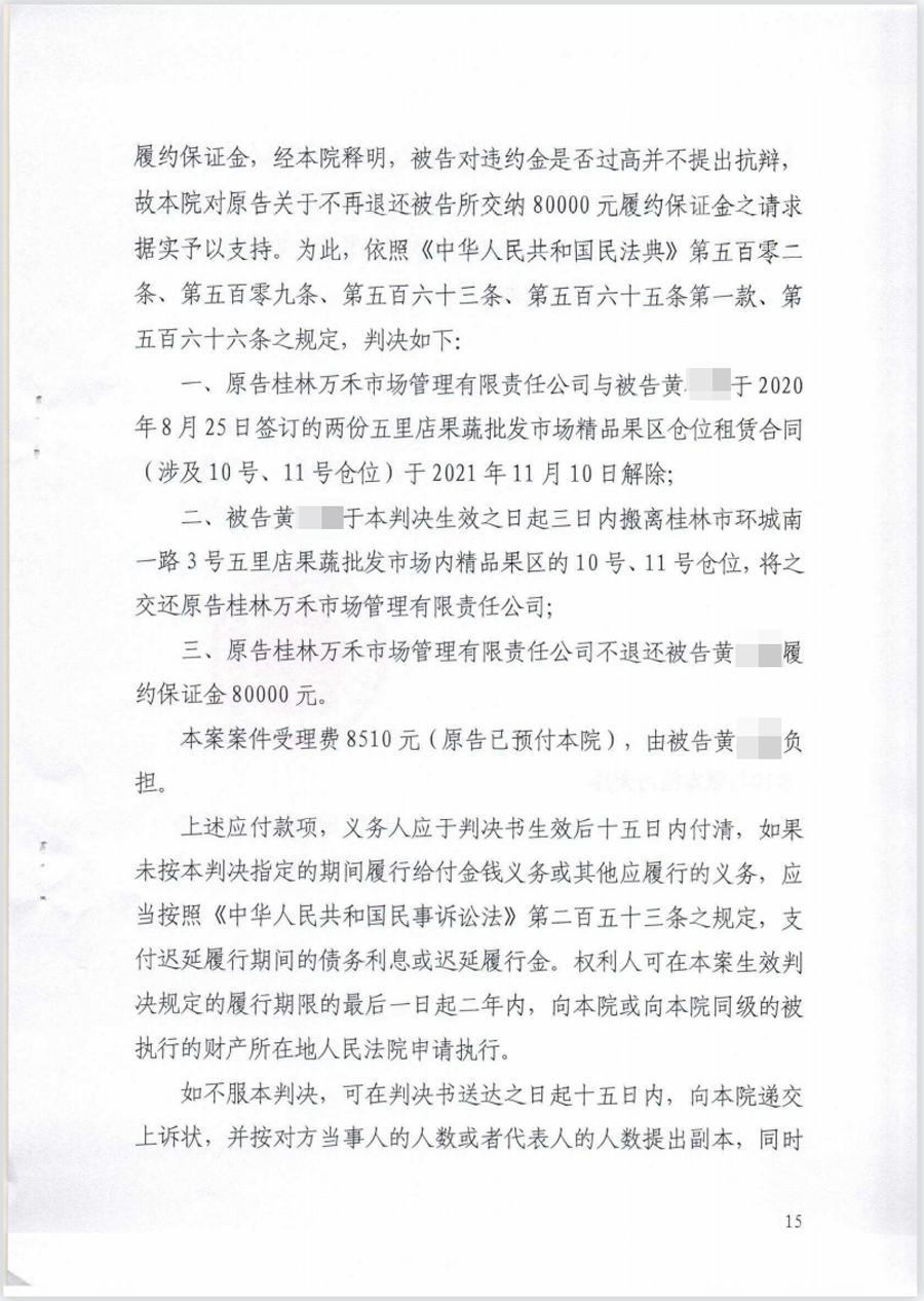 三、原告桂林萬(wàn)禾市場(chǎng)管理有限責(zé)任公司不退還被告黃某某履約保證金80000元。