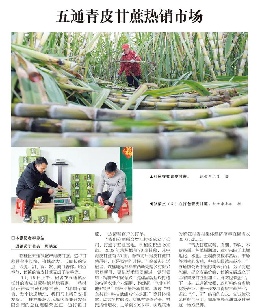 “我們公司聯(lián)合羅江村委成立了公司,打造了五通基地,種植面積近200畝。2022年共種植有70畝甘蔗,其中青皮甘蔗有30畝,春節(jié)前后青皮甘蔗口感最好,正是暢銷的時候?!瘪槝s杰告訴記者,該基地是桂林市兩新黨建鄉(xiāng)村振興示范項目,更是萬禾集團通過“黨旗領(lǐng)航·精耕產(chǎn)業(yè)促振興”黨建品牌建設(shè)打造的特色農(nóng)業(yè)產(chǎn)業(yè)品牌,構(gòu)建起“企業(yè)+基地+農(nóng)戶”的產(chǎn)業(yè)振興新模式,通過“村企共建+科技賦能+產(chǎn)業(yè)興旺”等具體模式,助力鄉(xiāng)村振興,實現(xiàn)村集體經(jīng)濟、村民持續(xù)增收,力爭到2025年,實現(xiàn)基地為羅江村委村集體經(jīng)濟每年直接增收30萬元以上。