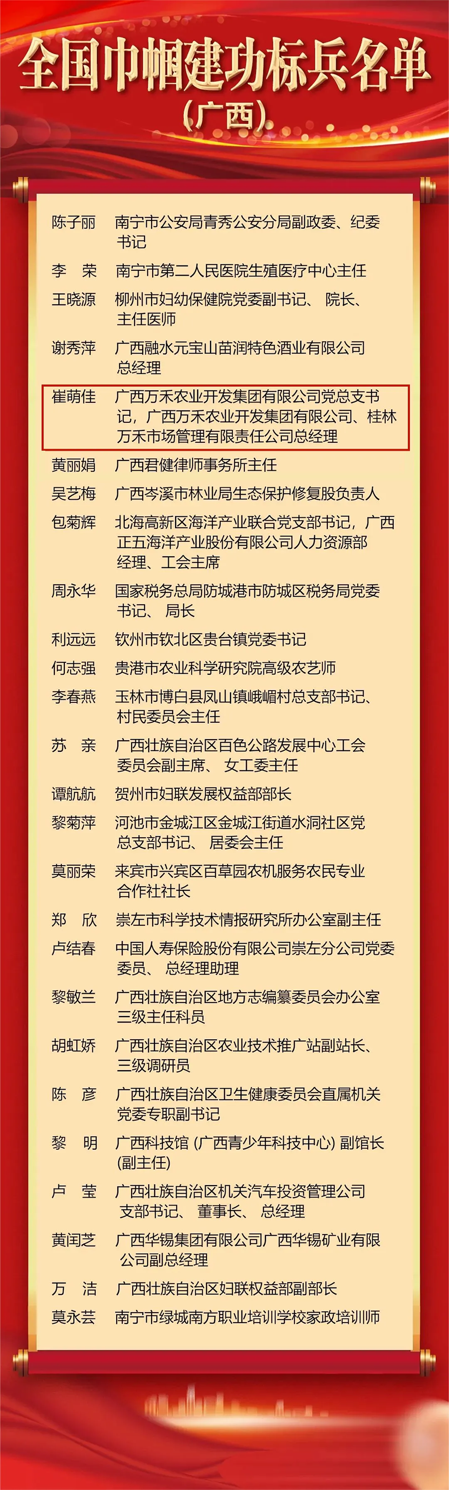 2月25日,全國婦聯(lián)印發(fā)《關(guān)于表彰全國三八紅旗手標(biāo)兵、全國三八紅旗手、全國三八紅旗集體和全國巾幗文明崗、全國巾幗建功標(biāo)兵、全國巾幗建功先進(jìn)集體的決定》,廣西萬禾農(nóng)業(yè)開發(fā)集團(tuán)有限公司黨總支書記,廣西萬禾農(nóng)業(yè)開發(fā)集團(tuán)有限公司、 桂林萬禾市場管理有限責(zé)任公司總經(jīng)理崔萌佳獲授“全國巾幗建功標(biāo)兵”稱號。