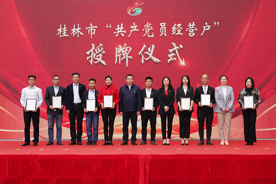 ▲萬禾集團(tuán)黨總支副書記夏四初(左五)領(lǐng)取桂林市“共產(chǎn)黨員經(jīng)營戶”榮譽牌匾