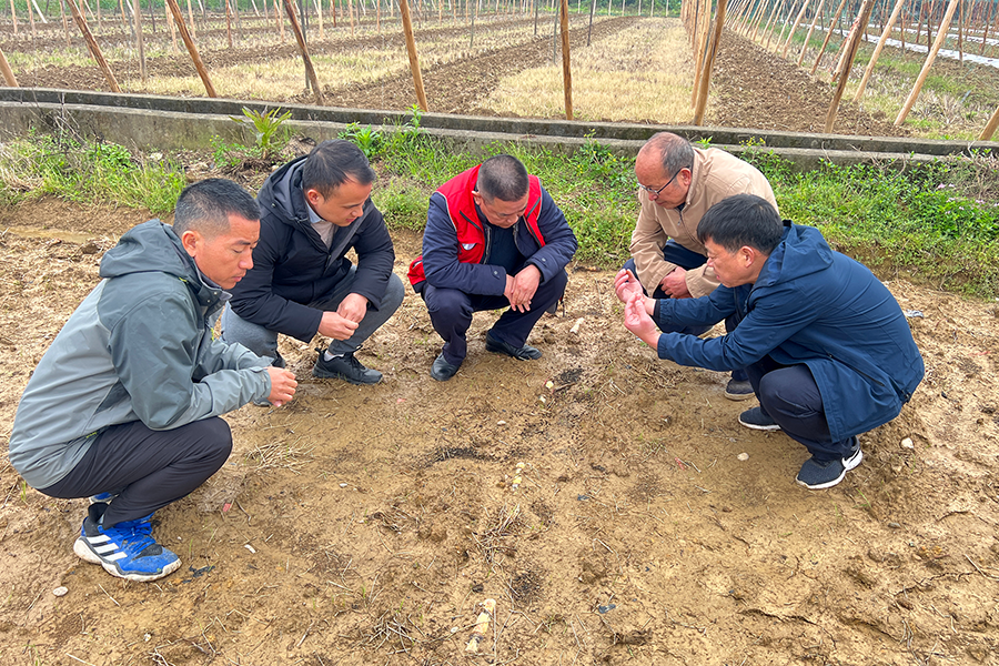 ▲李家文一行查看青皮甘蔗種莖受害情況