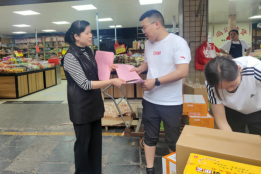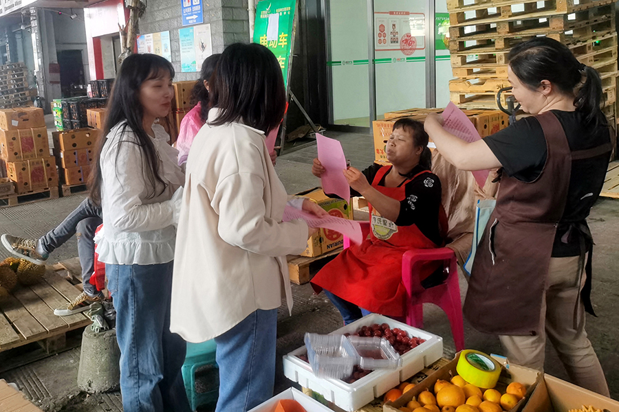 ▲黨員向市場(chǎng)經(jīng)營(yíng)戶宣導(dǎo)文明出行的重要性
