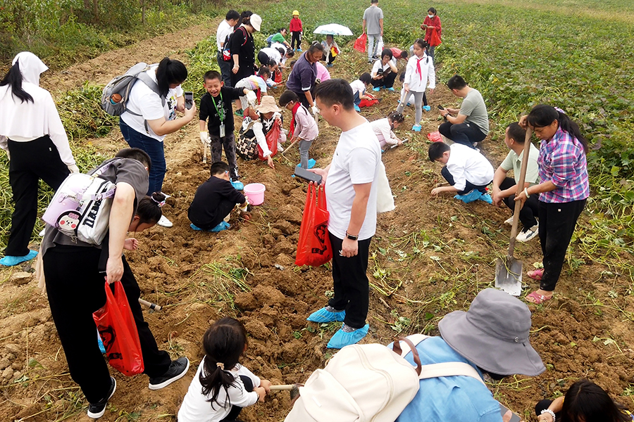 ▲挖紅薯掰玉米砍甘蔗師生家長們走進田間地頭體驗秋收農(nóng)務(wù)