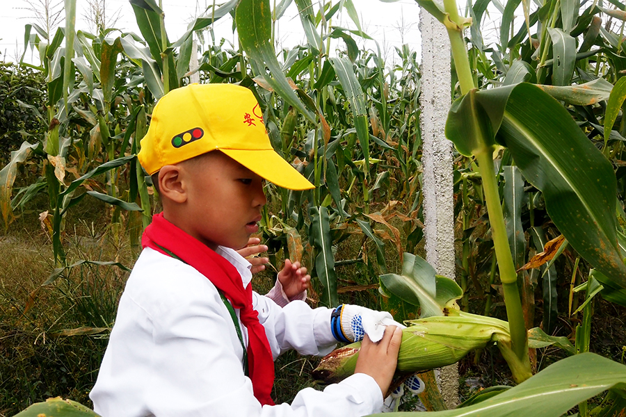 在玉米種植區(qū)前,技術(shù)人員就地取材,摘下一根成熟的玉米,并向同學(xué)們現(xiàn)場提問:“請問哪位同學(xué)知道玉米是通過什么辨別它是否成熟的?”“玉米須顏色程深褐色就表示成熟了”,有同學(xué)舉手回答道。對積極回答提問參與互動的同學(xué),技術(shù)人員以獎勵玉米的形式進一步激發(fā)同學(xué)們學(xué)習(xí)農(nóng)作物知識的興趣。